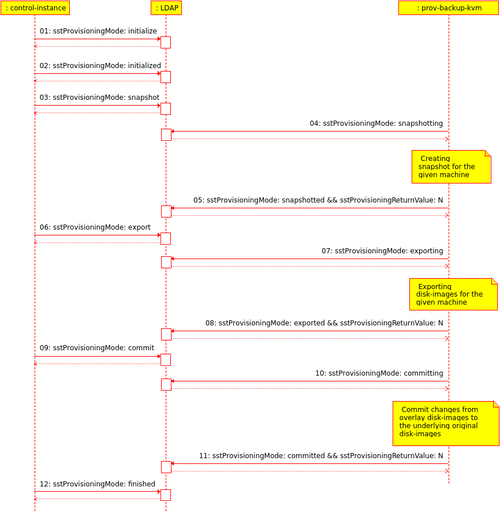 As soon as the Control instance daemon notices, that the attribute sstProvisioningMode ist set to retained, it sets the sstProvisioningMode to finished and the sstProvisioningState to the current timestamp (UTC). All interested parties now know, that the backup process is finished, there for a new backup process could be started.